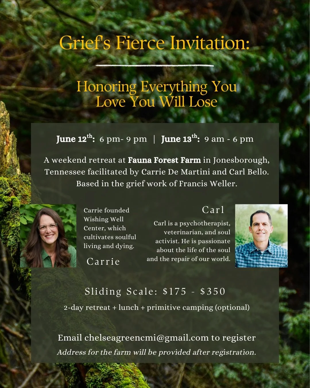 This weekend retreat is based in the community grief work of Francis Weller and is facilitated by Carrie De Martini and Carl Bello. Learn more here: https://www.facebook.com/share/1FGyHVphas/